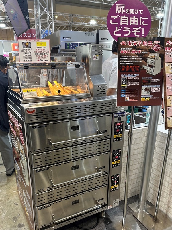 「電気芋焼器」を使用した実演も行い、スーパーや専門店に最適な据置タイプを用いて、焼き芋の試食をお配りしました。